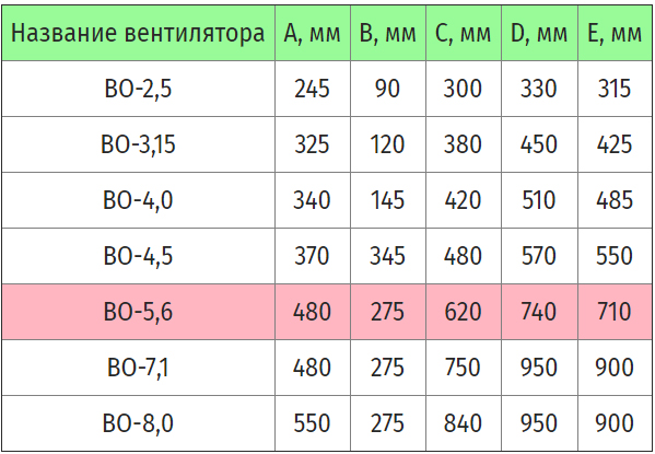 | Название вентилятора | A, мм | B, мм | C, мм | D, мм | Е, мм |